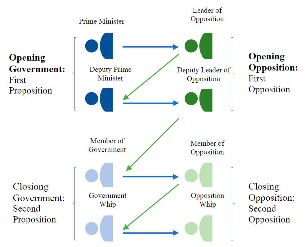 In British Parliamentary (BP) debate, four teams of two speakers each compete on a motion announced fifteen minutes before the round. The teams are divided into two “halves” - Opening and Closing - and two “sides” - Government (for the motion) and Opposition (against). Each speaker gets seven minutes. A panel of judges ranks all four teams from first to last. Crucially, you don’t choose your side - it’s assigned at random.